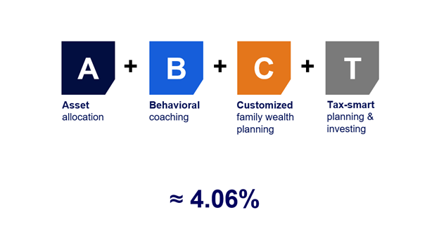 Our 2025 Value of an Advisor formula consists of four key elements in an advisor’s total value proposition: asset allocation to ensure the investor’s portfolio is designed to meet their financial goals while remaining aligned to their risk profile, their role as a behavioral coach to keep clients invested through thick and thin, customized wealth planning to guide their clients and families through the many stages of their financial life, and tax-smart planning and investing to help investors keep more of what they earn.