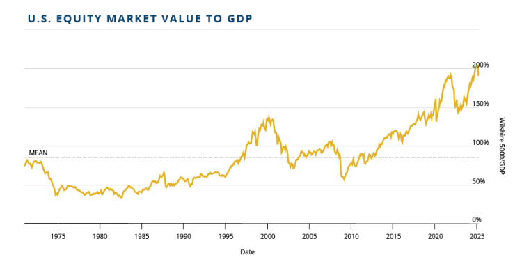 According to the well-observed Buffett Indicator[3]—a metric that compares the total market capitalization of a country’s publicly traded stocks to its gross domestic product (GDP)—the market cap to GDP ratio is 187.6% (as of March 31, 2025). At these levels, the indicator implies that U.S. equities remain significantly overvalued despite the recent correction.
