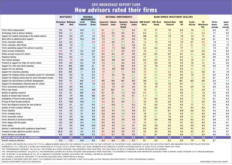 Another firm whose advisors are very satisfied is Richardson GMP, as it received exclusive top scores in 17 of the categories — as well as the highest IE rating. Although the fact that its advisors are equity owners in the firm plays a part, the firm’s advi-sors cited “strength of management” when they were asked to rate the firm in a supplementary question, “Your firm’s support for you and your business in coming out of the recession.”