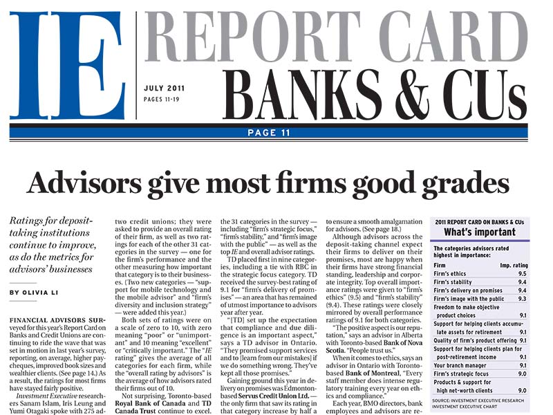 The latest version of Investment Executive’s Report Card on Banks and Credit Unions reveals that financial advisors who ply their trade within deposit-taking firms are enjoying growth and — perhaps more important — their businesses are continuing their transformation into more formidable competition for the traditional retail investment industry.
