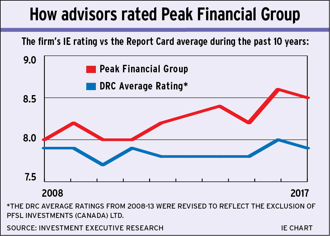 Peak Financial Group has received strong ratings from its advisor force during the past decade. In fact Peak’s IE rating has ranged between 8.0 and 8.6 over the years — surpassing the Report Card average each year in the process. Peak’s IE Rating reached a 10-year high in 2016, when advisors praised several improvements at the firm, including to their tech tools.Author: Fiona Collie Source: Investment Executive Research Copyright: Investment Executive -