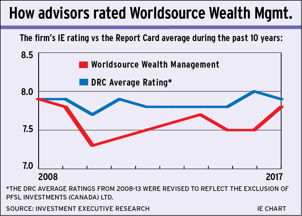 Worldsource Wealth Management has received middling reviews from advisors over the years. Specifically, Worldsource’s IE rating has hovered at or below the Report Card average since 2008. During that time, advisors have voiced concerns over management changes and the dealer’s “back office and administrative support,” but 2017 might just prove to be a turning point for the firm. This year, Worldsource’s IE rating hit 7.8 with advisors rating their firm higher in several categories, including the “firm’s reward and recognition program” and the “firm’s corporate culture.”Author: Fiona Collie Source: Investment Executive Research Copyright: Investment Executive