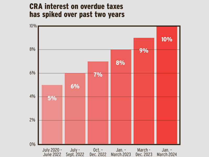 In January, the CRA will begin charging 10% interest on current or outstanding overdue taxes, up from 9% in the current quarter. The interest the CRA charges on overdue taxes is based on a prescribed rate, tied to the yield on Government of Canada three-month Treasury bills plus four percentage points, and recalculated every quarter.