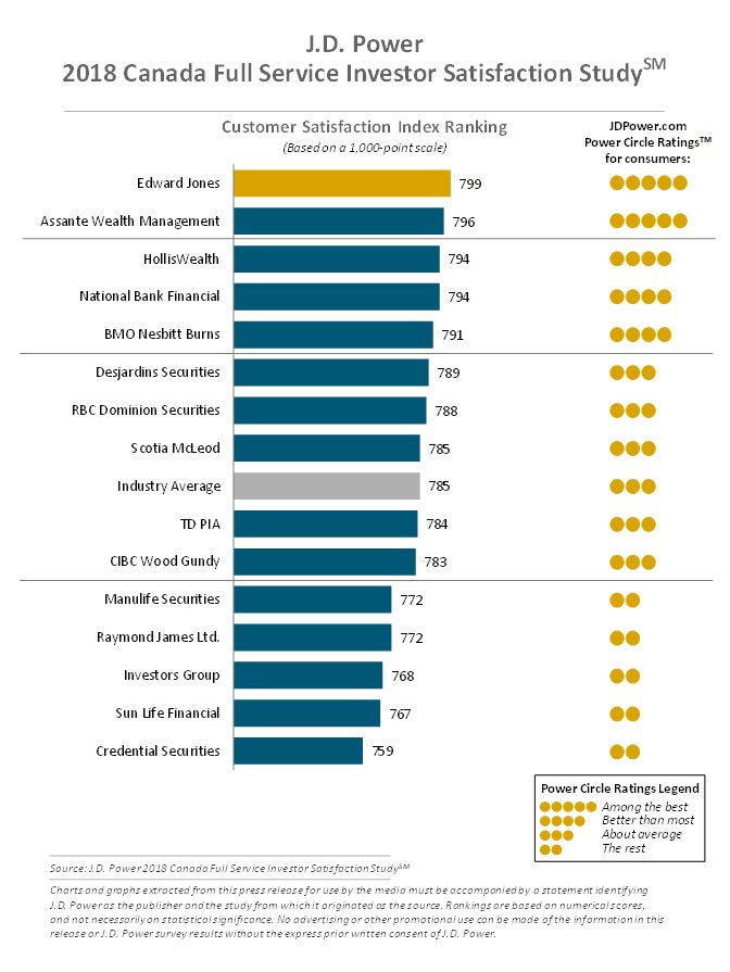 Edward Jones ranks highest in overall satisfaction for a sixth consecutive year, with a score of 799. Assante Wealth Management (796) ranks second, while HollisWealth and National Bank Financial rank third in a tie (794 each). In 2018, overall satisfaction is 785, up from 771 in 2017.
