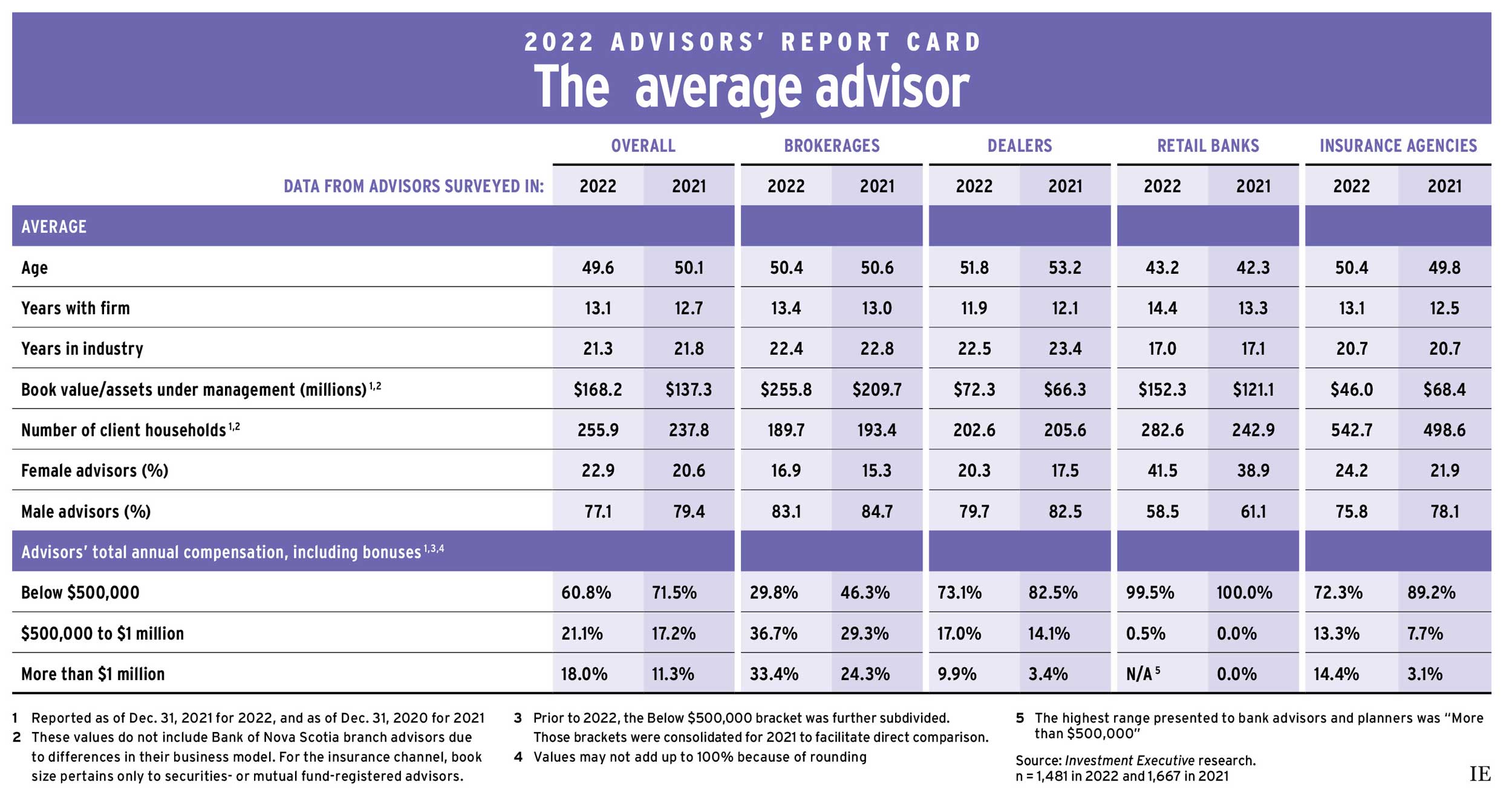 The industry also reported shifts in its underlying demographics. For example, the average advisor in this year’s Advisors’ Report Card is slightly younger than last year’s average: 49.6, compared with 50.1 in 2021.