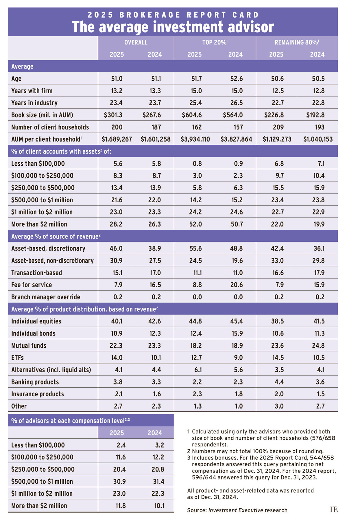 According to Investment Executive’s (IE) latest Brokerage Report Card, frontline investment advisors enjoyed strong growth in assets last year driven by a combination of market gains and growing client numbers. For the average advisor in IE’s Report Card this year, assets under management (AUM) rose 12.6% between Dec. 31, 2023 (the date for the data reported a year ago) and Dec. 31, 2024, topping the $300-million mark as advisors headed into 2025.
