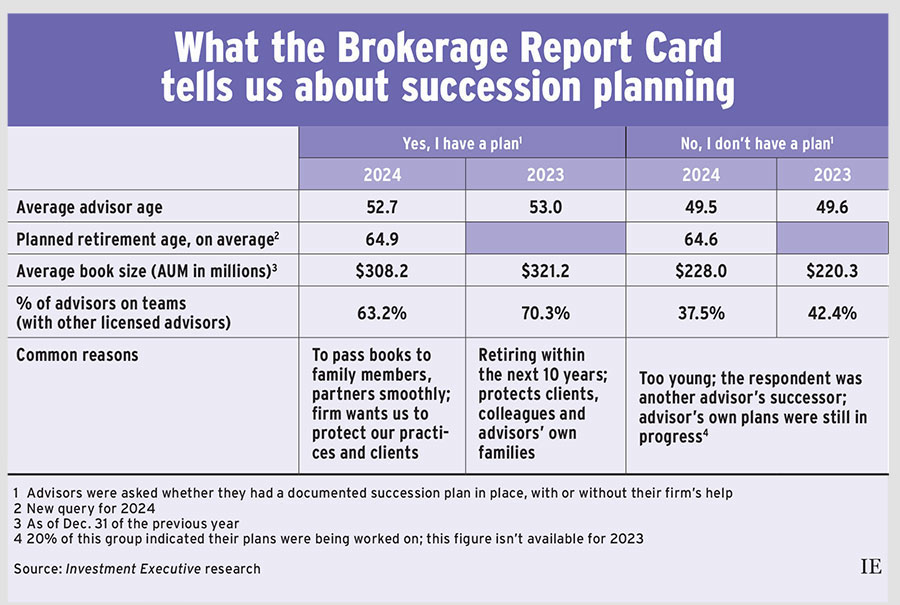 Advisors with plans highlighted that early planning is best. “A lot of advisors are retiring, and the firm does discuss [succession planning] often. It takes a lot of time and effort to have succession planning come together,” said an advisor with iA Private Wealth in Ontario.