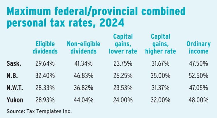 For top earners in New Brunswick, Northwest Territories, Saskatchewan and Yukon, the combined federal/provincial (/territorial) personal tax rate on the amount of capital gains over $250,000 realized in a year now exceeds the rate on eligible dividends by between two and three percentage points.