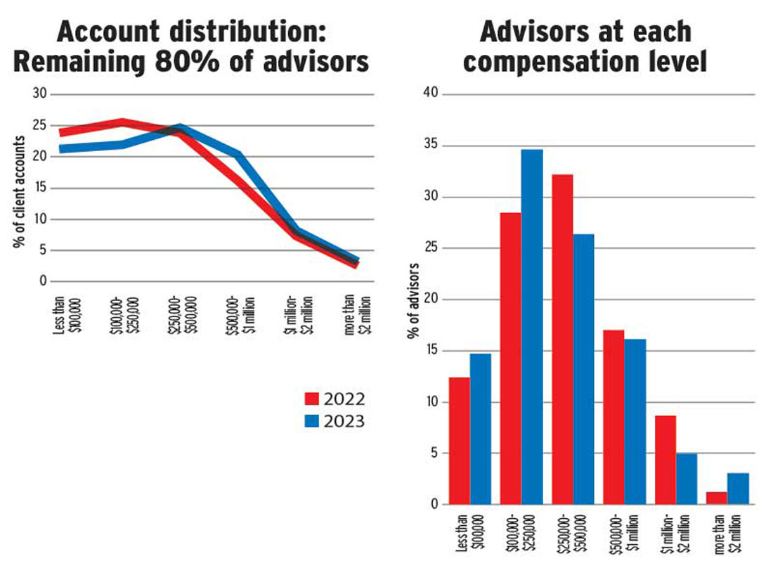 Dealer advisors generally reported that high-value accounts made up a larger share of their books than in last year’s research. Accounts worth more than $500,000 made up 40.6% of the average book, versus 34.9% last year. The share of accounts worth $1 million or more was 19.0% this year, up from 16.5% in 2022.