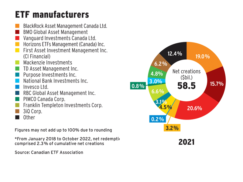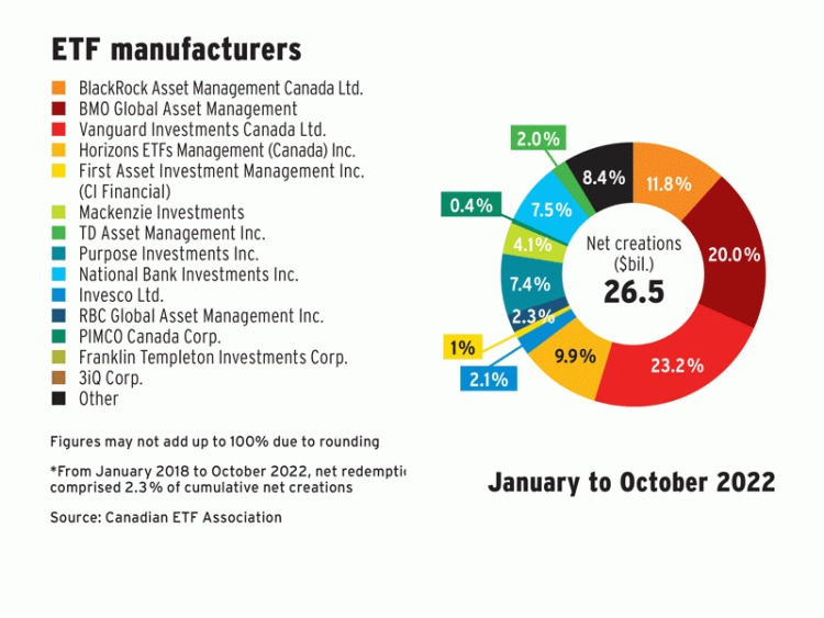 The ETF industry continued to grow this year despite miserable returns and surging net redemptions in the mutual fund space. ETF growth was driven by both retail and institutional investors: as of Dec. 31, 2018, institutional investors held 33.2% of all Canadian and U.S. ETF assets held by domestic investors. This proportion peaked at 41.4% on Sept. 30, 2020, but declined to 36.3% as of March 31, 2022, according to Investor Economics.