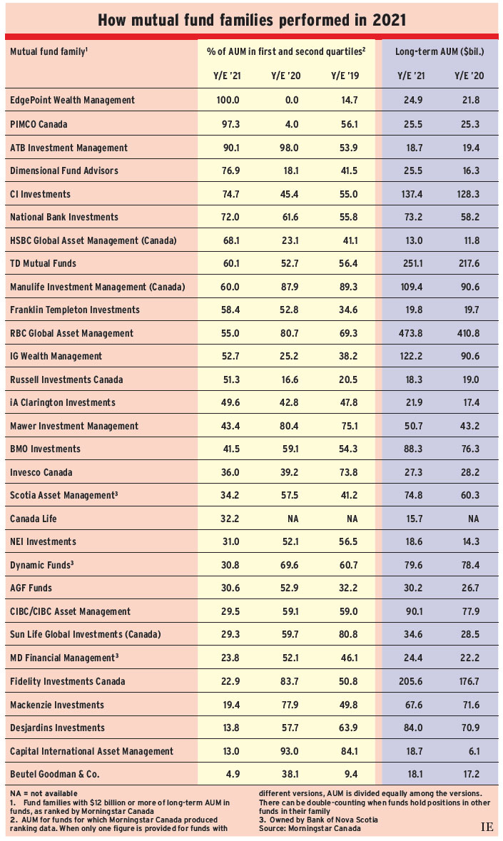 In 2021, three relatively small fund families headed the list: EdgePoint Wealth Management Inc., PIMCO Canada Corp. and Edmonton-based ATB Investment Management Inc. All three had at least 90% of their long-term assets under management (AUM) held in funds ranked in the first or second quartile for the year ended Dec. 31, 2021, according to Morningstar Canada. Interestingly, strong fixed-income performance pushed PIMCO and ATB to near the top of the list.