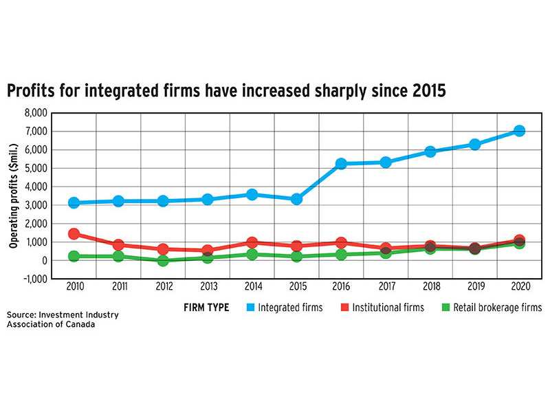 The large, integrated dealers that dominate the Canadian brokerage business enjoyed their fair share of these gains, but the boutique segment of the industry really feasted in 2020. Operating profit for retail-only firms collectively jumped by about 50% last year, and institutional boutiques saw their collective profit surge by more than 66%, topping $1 billion for the first time since 2010.