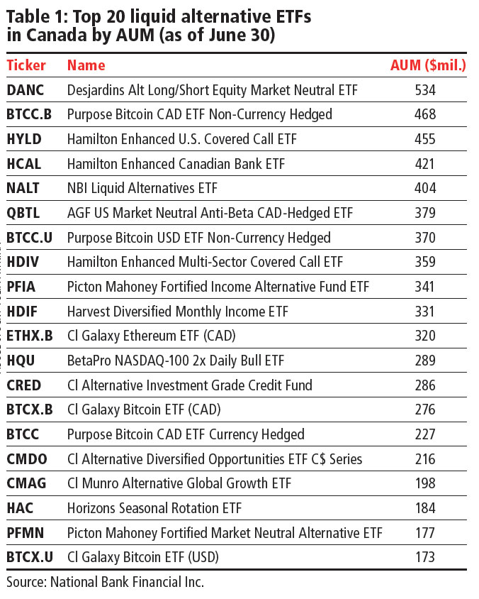 The category leader is Toronto-based Hamilton Capital Partners Inc. Rob Wessel, managing partner with Hamilton ETFs, said the products don’t use traditional alternative strategies but have landed in the liquid alts bucket for lack of another filing category.