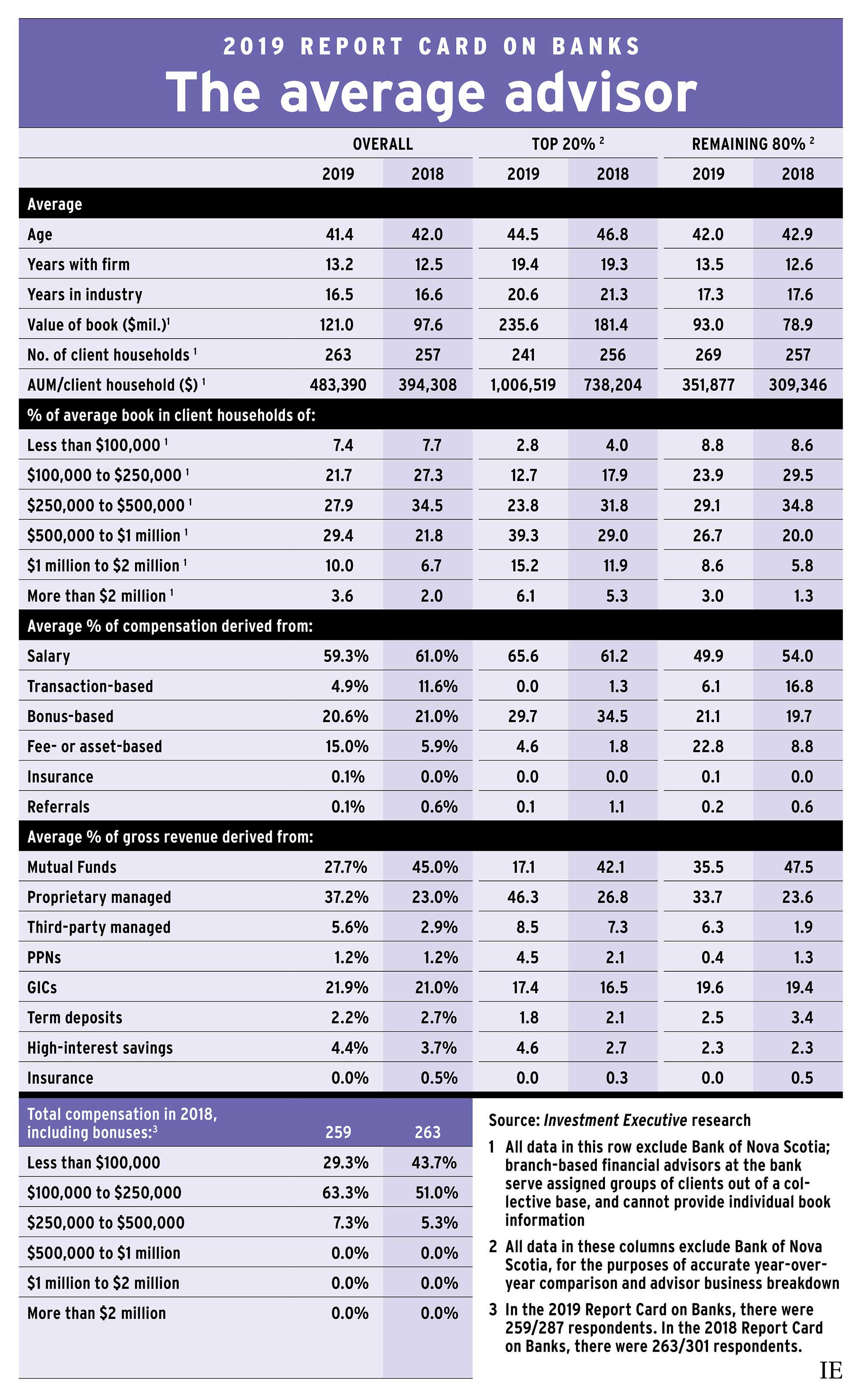 Financial advisors in our previous 2019 Report Cards have reported strong growth in their books over the past year, and the branch-based bank advisors of the Big Six appear to be sharing in the bounty.